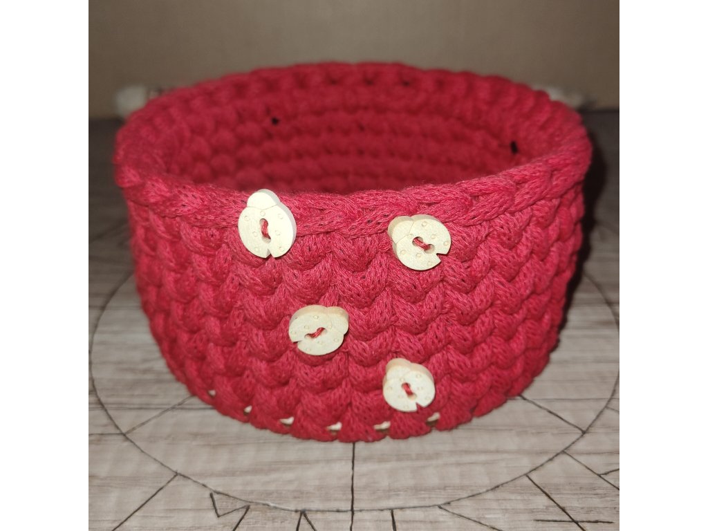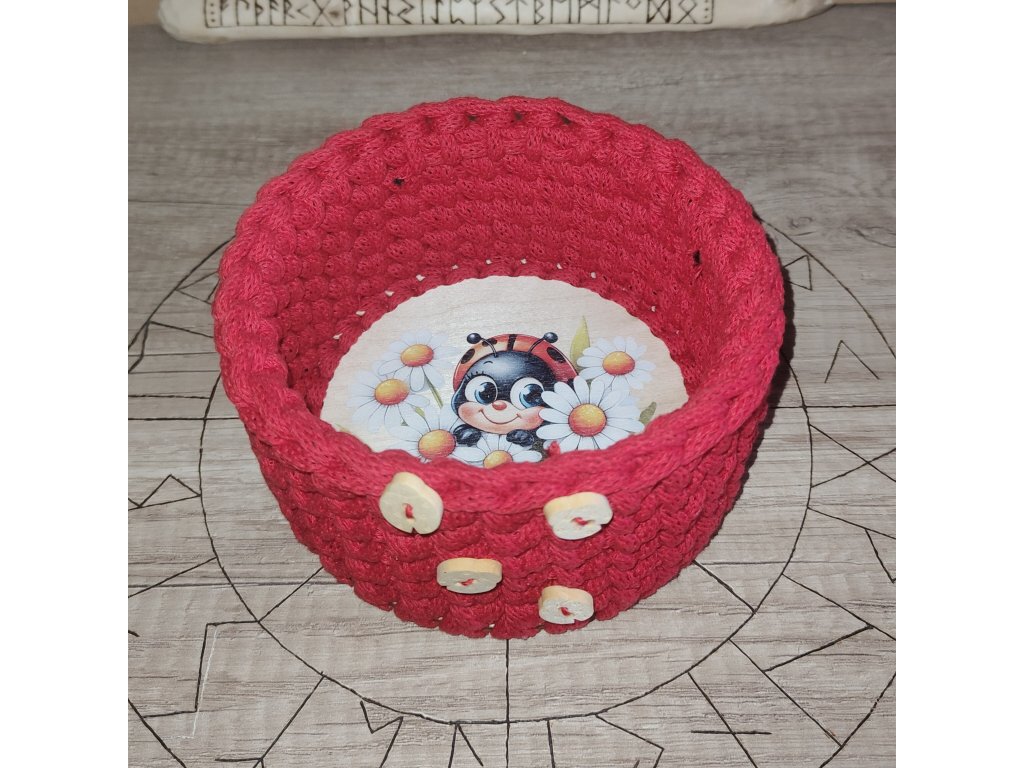 Červený, ručně háčkovaný košík s motivem berušky. Použitá příze je české výroby.