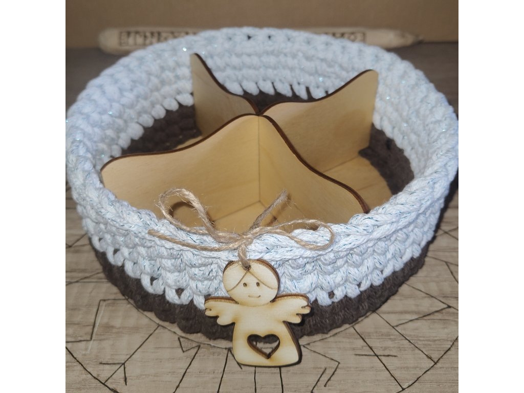 Hnědo-světle modrý, ručně háčkovaný košík s rozdělovníkem se čtyřmi přihrádkami. Použitá příze je české výroby.